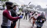 Petugas menyemprotkan cairan disinfektan ke arah pekerja sebelum memasuki area Gudang Logistik KPU Kabupaten Bandung, Kampung Sawah, Soreang, Kabupaten Bandung, Ahad (15/11). KPU Kabupaten Bandung mulai melakukan proses pelipatan dan penyortiran surat suara sebanyak 2.420.699 lembar dengan melibatkan 400 tenaga kerja lepas untuk pelaksanaan Pilkada Kabupaten Bandung 2020 pada Desember mendatang. (FOTO : ABDAN SYAKURA/REPUBLIKA)