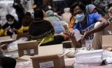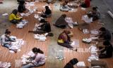 Pekerja melakukan pelipatan dan penyortiran surat suara di Gudang Logistik KPU Kabupaten Bandung, Kampung Sawah, Soreang, Kabupaten Bandung, Ahad (15/11). KPU Kabupaten Bandung mulai melakukan proses pelipatan dan penyortiran surat suara sebanyak 2.420.699 lembar dengan melibatkan 400 tenaga kerja lepas untuk pelaksanaan Pilkada Kabupaten Bandung 2020 pada Desember mendatang. (FOTO : ABDAN SYAKURA/REPUBLIKA)