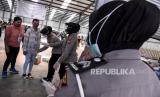 Petugas kepolisian memeriksa pekerja sebelum keluar dari area Gudang Logistik KPU Kabupaten Bandung, Kampung Sawah, Soreang, Kabupaten Bandung, Ahad (15/11). KPU Kabupaten Bandung mulai melakukan proses pelipatan dan penyortiran surat suara sebanyak 2.420.699 lembar dengan melibatkan 400 tenaga kerja lepas untuk pelaksanaan Pilkada Kabupaten Bandung 2020 pada Desember mendatang. (FOTO : ABDAN SYAKURA/REPUBLIKA)