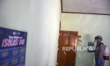 Warga menyemprotkan cairan disinfektan di area ruang isolasi pasien Covid-19 di Jalan Bapa Ampi, Baros, Kota Cimahi, Ahad (15/11). Warga RW 05 Kelurahan Baros berinisiatif mengubah gedung serbaguna menjadi ruang isolasi yang diberi nama Ranggon Imani (Ruang Kanggo Isolasi Mandiri) guna mengantisipasi dan penanganan awal jika ada warga di kawasan tersebut yang terpapar Covid-19. Foto: Abdan Syakura/Republika (FOTO : ABDAN SYAKURA/REPUBLIKA)