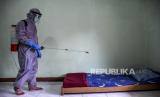 Warga menyemprotkan cairan disinfektan di area ruang isolasi pasien Covid-19 di Jalan Bapa Ampi, Baros, Kota Cimahi, Ahad (15/11). Warga RW 05 Kelurahan Baros berinisiatif mengubah gedung serbaguna menjadi ruang isolasi yang diberi nama Ranggon Imani (Ruang Kanggo Isolasi Mandiri) guna mengantisipasi dan penanganan awal jika ada warga di kawasan tersebut yang terpapar Covid-19. (FOTO : ABDAN SYAKURA/REPUBLIKA)