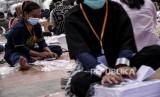 Pekerja melakukan pelipatan dan penyortiran surat suara di Gudang Logistik KPU Kabupaten Bandung, Kampung Sawah, Soreang, Kabupaten Bandung, Ahad (15/11). KPU Kabupaten Bandung mulai melakukan proses pelipatan dan penyortiran surat suara sebanyak 2.420.699 lembar dengan melibatkan 400 tenaga kerja lepas untuk pelaksanaan Pilkada Kabupaten Bandung 2020 pada Desember mendatang. Foto: Abdan Syakura/Republika (FOTO : ABDAN SYAKURA/REPUBLIKA)