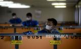 Petugas keamanan menatur alur masuk penumpang KM Dorolonda di Pelabuhan Tanjung Priok, Jakarta, Ahad (15/11). PT Pelayaran Nasional Indonesia (Pelni) mematuhi skenario protokol kesehatan Covid-19 pada kegiatan operasional yaitu dengan mewajibkan penumpang menggunakan masker, menerapkan jaga jarak, pembatasan penumpang maksimal 50 persen dari kapasitas dan Penggunaan APD bagi kru kapal. (FOTO : Prayogi/Republika)