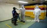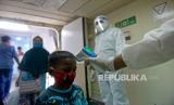 Kru kapal mengecek suhu penumpang sebelum keberangkatan KM Dorolonda di Pelabuhan Tanjung Priok, Jakarta, Ahad (15/11). PT Pelayaran Nasional Indonesia (Pelni) mematuhi skenario protokol kesehatan Covid-19 pada kegiatan operasional yaitu dengan mewajibkan penumpang menggunakan masker, menerapkan jaga jarak, pembatasan penumpang maksimal 50 persen dari kapasitas dan Penggunaan APD bagi kru kapal. (FOTO : Prayogi/Republika)