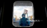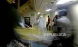 Kru kapal menyemprotkan cairan disinfektan sebelum keberangkatan KM Dorolonda di Pelabuhan Tanjung Priok, Jakarta, Ahad (15/11). PT Pelayaran Nasional Indonesia (Pelni) mematuhi skenario protokol kesehatan Covid-19 pada kegiatan operasional yaitu dengan mewajibkan penumpang menggunakan masker, menerapkan jaga jarak, pembatasan penumpang maksimal 50 persen dari kapasitas dan Penggunaan APD bagi kru kapal. (FOTO : Prayogi/Republika)