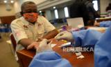 Petugas kesehatan mengambil sampel darah anggota Panitia Pemungutan Suara (PPS) dan panitia pemilihan kecamatan (PPK) saat mengikuti rapid test di Kantor Wali Kota, Depok, Jawa Barat, Senin (16/11). Sebanyak 294 petugas anggota PPS dan PPK se-Kota Depok mengikuti tes cepat COVID-19 guna memastikan kondisi sehat dan siap bertugas pelaksanaan Pemilihan Kepala Daerah (Pilkada) Kota Depok pada 9 Desember 2020 (FOTO : Prayogi/Republika)