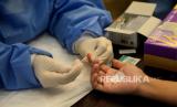 REPUBLIKA.CO.ID, DEPOK -- Petugas kesehatan mengambil sampel darah anggota Panitia Pemungutan Suara (PPS) dan panitia pemilihan kecamatan (PPK) saat mengikuti rapid test di Kantor Wali Kota, Depok, Jawa Barat, Senin (16/11).