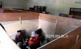 Petugas menyiapkan bilik asmara di Barak Pengungsian Balai Desa Deyangan, Mungkid, Jawa Tengah, Senin (16/11). Fasilitas pendukung di barak pengungsian sangat dibutuhkan oleh pengungsi. Seperti sarana kesehatan, mushola, ruang laktasi, dan bilik asmara. Bilik asmara dan bilik laktasi menjadi sarana pendukung yang terbaru untuk pengungsi. (FOTO : Wihdan Hidayat / Republika)