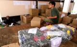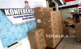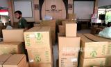 Petugas menata logistik tambahan untuk Pilkada serentak di KPUD Bantul, Yogyakarta, Selasa (17/11). Perlengkapan alat pelindung diri menjadi salah satu logistik pada Pilkada serentak 2020. Hal ini mengingat kondisi pandemi Covid-19 yang belum berakhir. Masker, pelindung wajah, sarung tangan, penyemprot, dan hand sanitizer menjadi logistik tambahan bagi petugas. (FOTO : Wihdan Hidayat / Republika)