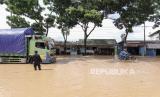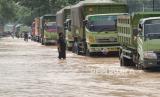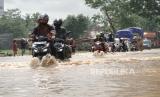 REPUBLIKA.CO.ID, BANYUMAS -- Sejumlah kendaraan roda dua menerobos banjir yang menggenangi jalur selatan di Desa Kedungpring, Kemranjen, Banyumas, Jateng, Selasa (17/11). Banjir tersebut diakibatkan jebolnya tanggul Kali Gatel setelah hujan deras itu sehingga menyebabkan kendaraan yang melintas di jalur selatan terjebak banjir.