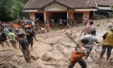 Sejumlah petugas dan relawan dibantu oleh warga, melakukan proses pencarian korban longsor di Desa Banjarpanepen, Sumpiuh, Banyumas, Jateng, Selasa (17/11/2020). Empat orang meninggal dunia tertimbun material longsor dari tebing setinggi 30 meter yang menimpa tiga rumah warga, dengan jarak luncuran mencapai satu kilometer. Hingga Selasa (17/11) tim SAR dan warga telah menemukan satu korban dan masih melakukan pencarian terhadap tiga korban lainya. (FOTO : ANTARA/Idhad Zakaria)