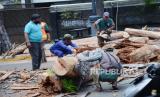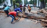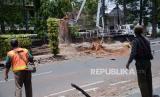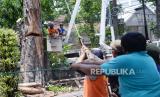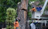 Petugas Dinas Perumahan, Kawasan Pemukiman, Pertanahan dan Pertamanan (DPKP3) Kota Bandung, menebang poho besar yang telah lapuk dan keropos, di Jalan Ir H Juanda, Kota Bandung, Selasa(1711). Penebangan pohon mati tersebut sebagai upaya mencegah terjadinya pohon tumbang yang sangat membahayakan pengguna jalan. (FOTO : Edi Yusuf/Republika)