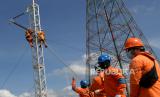 Teknisi PLN melakukan perbaikan jaringan listrik yang putus pada kegiatan Apel dan Simulasi Kesiapsiagaan Bencana Alam di Manado, Sulawesi Utara, Rabu (18/11/2020). Apel dan simulasi yang melibatkan unsur TNI,Polri, BPBD, SAR, Bakamla, PLN, Petugas Kesehatan, dan Relawan ini bertujuan untuk meningkatkan kesiapsiagaan menghadapi ancaman bencana alam dan hidrometeorologi di wilayah Provinsi Sulut menjelang akhir tahun. (FOTO : ANTARA/Adwit B Pramono)