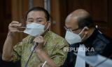 Terpidana kasus cessie Bank Bali Djoko Tjandra (kiri) bersiap menjalani sidang lanjutan di Pengadilan Tipikor, Jakarta, Kamis (19/11). Sidang tersebut beragendakan pemeriksaan sejumlah saksi yang dihadirkan oleh Jaksa Penuntut Umum atas perkara suap kepada jaksa dan perwira tinggi Polri serta pemufakatan jahat. (FOTO : Republika/Thoudy Badai)
