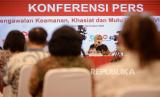 Kepala Badan Pengawasan Obat dan Makanan (BPOM) Penny K Lukito (kiri) saat konferensi pers di Kantor BPOM, Jakarta, Kamis (19/11). Kepala BPOM mengatakan Emergency Use of Authorization (EUA) vaksin Covid-19 Sinovac diharapkan keluar pada akhir bulan Januari 2021 mendatang. Republika/Thoudy Badai (FOTO : Republika/Thoudy Badai)