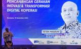 REPUBLIKA.CO.ID, BANDUNG -- Menteri KUKM RI Teten Masduki memberikan sambutan saat mencanangkan Gerakan Inovasi dan Transformasi Digital Koperasi di Bandung, Kamis (19/11).