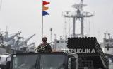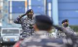 Panglima Koarmada I Laksamana Muda TNI Abdul Rasyid Kacong (kiri) memberi hormat saat Gelar Pasukan Latihan Operasi Dukungan Tembakan tahun 2020 Koarmada I di Dermaga JICT II, Tanjung Priok, Jakarta, Jumat (20/11/2020). Latihan operasi yang akan berlangsung pada 20-26 November mendatang di perairan Natuna Selatan dan sekitarnya bertujuan untuk meningkatkan kemampuan personel dalam merencanakan, menyiapkan persenjataan dan ketepatan penembakan terhadap sasaran yang dilakukan secara gabungan dalam bentuk unsur fungsi serta meningkatkan interoperabilitas antar satuan yang terlibat mulai dari tahap deteksi sampai dengan tahap netralitas.  (FOTO : ANTARA/M Risyal Hidayat)