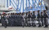 Sejumlah prajurit TNI AL mengikuti Gelar Pasukan Latihan Operasi Dukungan Tembakan tahun 2020 Koarmada I di Dermaga JICT II, Tanjung Priok, Jakarta, Jumat (20/11/2020). Latihan operasi yang akan berlangsung pada 20-26 November mendatang di perairan Natuna Selatan dan sekitarnya bertujuan untuk meningkatkan kemampuan personel dalam merencanakan, menyiapkan persenjataan dan ketepatan penembakan terhadap sasaran yang dilakukan secara gabungan dalam bentuk unsur fungsi serta meningkatkan interoperabilitas antar satuan yang terlibat mulai dari tahap deteksi sampai dengan tahap netralitas.  (FOTO : ANTARA/M Risyal Hidayat)