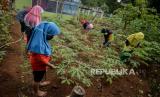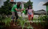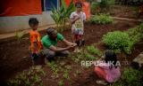 Anak-anak melakukan praktik berkebun di area edukasi pengolahan sampah Padepokan Restu Bumi, Ciracas, Jakarta, Sabtu (21/11). Dinas Lingkungan Hidup dan Kehutanan (LHK) Jakarta Timur mengadakan program edukasi urban farming seperti penanaman padi, budidaya maggot, berkebun dan berternak. Kegiatan itu juga memperingati Hari Pohon Sedunia yang jatuh tiap tanggal 21 November. Republika/Thoudy Badai (FOTO : Republika/Thoudy Badai)