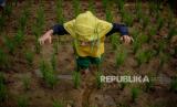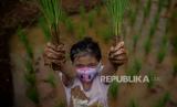 Anak-anak menanam padi di area edukasi pengolahan sampah Padepokan Restu Bumi, Ciracas, Jakarta, Sabtu (21/11). Dinas Lingkungan Hidup dan Kehutanan (LHK) Jakarta Timur mengadakan program edukasi urban farming seperti penanaman padi, budidaya maggot, berkebun dan berternak. Kegiatan itu juga memperingati Hari Pohon Sedunia yang jatuh tiap tanggal 21 November. Republika/Thoudy Badai (FOTO : Republika/Thoudy Badai)