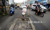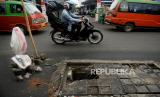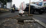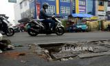 REPUBLIKA.CO.ID, BEKASI -- Tutup beton penutup lubang drainase di jalan Raya Pondok Gede, Bekasi, Jawa Barat, tampak rusak. Kondisi jalan berlubang tersebut sangat membahayakan pengguna jalan serta mengakibatkan kemacetan.