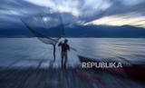 Seorang nelayan membawa jaringnya ke laut untuk menangkap udang kecil di Pantai Teluk Palu, Sulawesi Tengah, Minggu (22/11/2020). Udang kecil tersebut kemudian dijual dengan harga rata-rata Rp10.000 per kilogram basah. (FOTO : BASRI MARZUKI/ANTARA )