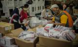 Petugas menyortir surat suara Pilkada Depok di gudang logistik Komisi Pemilihan Umum (KPU) Kota Depok, Cimanggis, Depok, Jawa Barat, Selasa (24/11). Logistik yang sudah diterima di gudang logistik KPU Depok diantaranya kotak suara, surat suara, hologram dan sampul. KPU Kota Depok menetapkan jumlah daftar pemilih tetap (DPT) pada Pilkada Depok 2020 mencapai 1.229.362 pemilih yang tersebar di 11 kecamatan. Republika/Thoudy Badai (FOTO : Republika/Thoudy Badai)