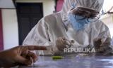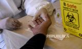 Petugas kesehatan mengambil sampel darah petugas KPPS saat tes cepat (rapid test) Covid-19 di Kantor Kecamatan Soreang, Soreang, Kabupaten Bandung, Kamis (26/11). Komisi Pemilihan Umum (KPU) Kabupaten Bandung melakukan tes cepat terhadap 61.866 petugas KPPS dan petugas Pengamanan Tempat Pemungutan Suara (PAM TPS) guna mengantisipasi penyebaran Covid-19 saat pemungutan suara Pilkada Kabupaten Bandung pada Desember mendatang. (FOTO : ABDAN SYAKURA/REPUBLIKA)