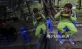 Warga memakan hidangan nasi kuning yang telah dibelinya di Warung Nasi Kuning Podjok Halal di Taman Situ Lembang, Menteng, Jakarta, Kamis (26/11). Menu makanan nasi kuning, lauk, sayur, dan air minum yang disajikan dibanderol dengan harga Rp 3.000 per porsi bagi kaum fakir, dhuafa, para Penyedia Jasa Lainnya Perorangan (PJLP) dari berbagai suku dinas, dan pekerja Penanganan Sarana dan Prasarana Umum (PPSU) kelurahan. (FOTO : Republika/Putra M. Akbar)