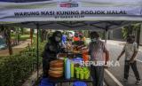 Sejumlah warga memesan nasi kuning di Warung Nasi Kuning Podjok Halal di Taman Situ Lembang, Menteng, Jakarta, Kamis (26/11). Menu makanan nasi kuning, lauk, sayur, dan air minum yang disajikan dibanderol dengan harga Rp 3.000 per porsi bagi kaum fakir, dhuafa, para Penyedia Jasa Lainnya Perorangan (PJLP) dari berbagai suku dinas, dan pekerja Penanganan Sarana dan Prasarana Umum (PPSU) kelurahan. (FOTO : Republika/Putra M. Akbar)