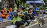 Sejumlah warga memakan hidangan nasi kuning yang telah dibelinya di Warung Nasi Kuning Podjok Halal di Taman Situ Lembang, Menteng, Jakarta, Kamis (26/11). Menu makanan nasi kuning, lauk, sayur, dan air minum yang disajikan dibanderol dengan harga Rp 3.000 per porsi bagi kaum fakir, dhuafa, para Penyedia Jasa Lainnya Perorangan (PJLP) dari berbagai suku dinas, dan pekerja Penanganan Sarana dan Prasarana Umum (PPSU) kelurahan. (FOTO : Republika/Putra M. Akbar)