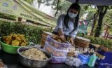 Petugas menyiapkan makanan yang dijual Warung Nasi Kuning Podjok Halal di Taman Situ Lembang, Menteng, Jakarta, Kamis (26/11). Menu makanan nasi kuning, lauk, sayur, dan air minum yang disajikan dibanderol dengan harga Rp 3.000 per porsi bagi kaum fakir, dhuafa, para Penyedia Jasa Lainnya Perorangan (PJLP) dari berbagai suku dinas, dan pekerja Penanganan Sarana dan Prasarana Umum (PPSU) kelurahan. (FOTO : Republika/Putra M. Akbar)