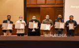 Pemimpin Redaksi Republika Irfan Junaidi (kedua kanan) berfoto bersama Ketua Bidang Kerjasama dan Sinergi Forum Zakat Angga Nugraha (ketiga kiri), Wakil Ketua Bidang Kerjasama dan Sinergi Forum Zakat Sigit Iko Sugondo (kanan) usai penandatanganan nota kesepahaman pada acara focus grup discussion (FGD) Forum Zakat di Hotel Aryaduta, Jalan Sumatera, Kota Bandung, Jumat (27/11). Focus grup discussion tersebut mengangkat tema Tantangan dan Peluang Kolaborasi dan Kerja Sama Tiga Tahun Mendatang. (FOTO : ABDAN SYAKURA/REPUBLIKA)