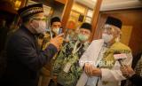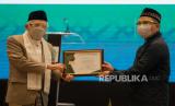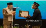 REPUBLIKA.CO.ID, JAKARTA -- Wakil Presiden Republik Indonesia Maruf Amin (kiri) memberikan penghargaan kepada Wakil Pemimpin Redaksi Republika Nur Hasan Murtiaji (kanan) di sela Penutupan Musyawarah Nasional X MUI di Jakarta, Jumat (27/11).