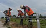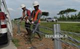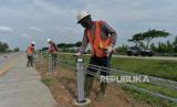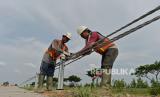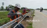 Pekerja memasang pembatas jalan dari sling baja atau wire rope di ruas tol Cikopo-Palimanan, Cirebon, Kamis (26/11). Untuk menambah keamanan pengguna tol Cipali, ASTRA Tol Cipali memasang wire rope di sepanjang ruas tol. Saat ini wire rope telah terpasang sepanjang 44 KM, dan ditargetkan pada tahun 2021 mendatang akan terpasang di ruas tol Cipali sepanjang 106 KM. (FOTO : Republika/Edwin Dwi Putranto)