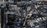 Sejumlah warga korban kebakaran pemukiman saat beraktivitas diantara puing-puing bangunan di kawasan Petamburan II, Jakarta, Senin (30/11). Kebakaran yang menghanguskan 12 bangunan pada Ahad (29/11) malam itu membuat seratus warga terpaksa mengungsi karena kehilangan tempat tinggal. Republika/Putra M. Akbar (FOTO : Republika/Putra M. Akbar)