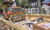 Wakil Wali Kota Bandung Yana Mulyana menggunakan alat berat memusnahkan berbagai macam barang bukti tindak pidana umum di Kantor Kejaksaan Negeri Kota Bandung, Jalan Jakarta, Kota Bandung, Selasa (1/12). Kejaksaan Negeri Kota Bandung bersama instansi terkait memusnahkan berbagai barang bukti tindak pidana umum hasil penindakan sepanjang periode Mei 2020 - Oktober 2020 berupa 3.461,86 gram ganja, 96,8879 gram tembakau sintetis, 616,9046 gram sabu, 1.362 tablet psikotropika berbagai merk serta barang bukti alat kejahatan seperti senjata api dan senjata tajam. Foto: Abdan Syakura/Republika (FOTO : ABDAN SYAKURA/REPUBLIKA)