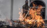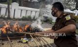 Wakil Wali Kota Bandung Yana Mulyana (kelima kanan) bersama Kepala Kejaksaan Negeri Kota Bandung M Iwa Suwia Pribawa (keempat kiri) memusnahkan berbagai barang bukti tindak pidana umum dengan cara dibakar di Kantor Kejaksaan Negeri Kota Bandung, Jalan Jakarta, Kota Bandung, Selasa (1/12). Kejaksaan Negeri Kota Bandung bersama instansi terkait memusnahkan berbagai barang bukti tindak pidana umum hasil penindakan sepanjang periode Mei 2020 - Oktober 2020 berupa 3.461,86 gram ganja, 96,8879 gram tembakau sintetis, 616,9046 gram sabu, 1.362 tablet psikotropika berbagai merk serta barang bukti alat kejahatan seperti senjata api dan senjata tajam. (FOTO : ABDAN SYAKURA/REPUBLIKA)