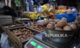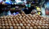 Pedagang menata telur dagangannya di Pasar Tebet Timur, Jakarta, Selasa (1/12). Badan Pusat Statistik (BPS) mencatat kenaikan harga sejumlah pangan telah memicu terjadinya inflasi pada November 2020 sebesar 0,28 persen. (FOTO : Prayogi/Republika)