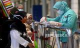 Petugas memeriksa kelengkapan penumpang sebelum memasuki area peron di Stasiun Pasar Senen, Jakarta, Selasa (1/12). PT Kereta Api Indonesia (KAI) Daerah Operasi (Daop) 1 Jakarta membuka pemesanan tiket kereta api (KA) jarak jauh untuk periode H+30 atau hingga 31 Desember 2020. Hal ini dilakukan PT KAI demi mempersiapkan momen Natal dan Tahun Baru 2021.Prayogi/Republika. (FOTO : Prayogi/Republika)
