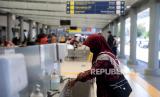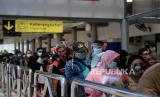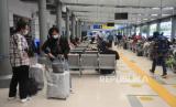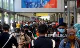 REPUBLIKA.CO.ID, JAKARTA -- Sejumlah penumpang mengantri untuk memasuki area peron di Stasiun Pasar Senen, Jakarta, Selasa (1/12).