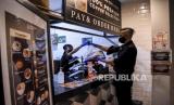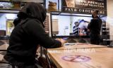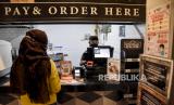 Pegawai melayani pesanan pelanggan dengan sistem take away di salah satu kafe di Jalan Sumur Bandung, Kota Bandung, Selasa (1/12). Gugus Tugas Covid-19 Kota Bandung mengimbau agar kafe, restoran atau sektor usaha pariwisata lainnya untuk kembali memberlakukan pelayanan take away (bawa pulang) dan jam operasional berkurang hingga pukul 19.00 dampak dari perubahan status level kewaspadaan penyebaran Covid-19 Kota Bandung dari zona oranye menjadi zona merah. (FOTO : ABDAN SYAKURA/REPUBLIKA)