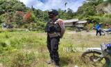 Seorang anggota polisi melakukan pengamanan disekitar perkampungan warga yang menjadi lokasi penyerangan yang diduga dilakukan kelompok teroris Mujahidin Indonesia Timur (MIT) pimpinan Ali Kalora, di Dusun Lewonu, Desa Lemban Tongoa, Kabupaten Sigi, Sulawesi Tengah, Selasa (1/12/2020). Serangan yang terjadi pada Jumat (27/11/2020) itu menewaskan empat warga dan hingga kini aparat TNI dan Polri yang tergabung dalam Satgas Tinombala terus berupaya melakukan pengejaran untuk menangkap para pelaku. (FOTO : ANTARA FOTO/Mohamad Hamzah)