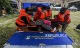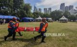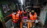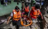 Sejumlah petugas kesehatan mengevakuasi warga saat simulasi terjadinya banjir di kawasan Karet Tengsin, Jakarta, Rabu (2/12). Pemerintah Kota Jakarta Pusat melakukan simulasi pada kegiatan simulasi kampung siaga bencana sebagai bentuk persiapan penanganan banjir yang kerap terjadi di kawasan tersebut. Republika/Putra M. Akbar (FOTO : Republika/Putra M. Akbar)