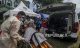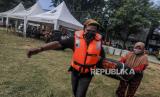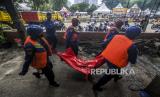 Sejumlah petugas pemadam kebakaran melakukan simulasi evakuasi jenazah saat terjadi banjir di kawasan Karet Tengsin, Jakarta, Rabu (2/12). Pemerintah Kota Jakarta Pusat melakukan simulasi pada kegiatan simulasi kampung siaga bencana sebagai bentuk persiapan penanganan banjir yang kerap terjadi di kawasan tersebut. (FOTO : Republika/Putra M. Akbar)