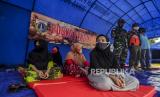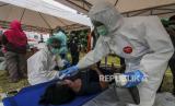 Sejumlah petugas kesehatan mengecek kesehatan warga saat terjadi simulasi banjir di kawasan Karet Tengsin, Jakarta, Rabu (2/12). Pemerintah Kota Jakarta Pusat melakukan simulasi pada kegiatan simulasi kampung siaga bencana sebagai bentuk persiapan penanganan banjir yang kerap terjadi di kawasan tersebut. Republika/Putra M. Akbar (FOTO : Republika/Putra M. Akbar)