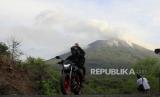 Seorang pengendara bermotor melaju dengan latar belakang gunung Ili Lewotolok yang masih mengeluarkan material Vulkanik di desa Jontona, Kecamatan Ile Ape Timur, Kabupaten Lembata, NTT, Rabu (2/12/2020). Berdasarkan laporan pos pemantauan Gunung Ili Lewotolok, aktivitas gunung api tersebut masih fluktuatif, yakni erupsi masih terus terjadi dengan intensitas sedang dan tinggi. (FOTO : ANTARA/Kornelis Kaha)