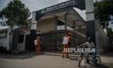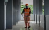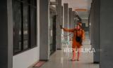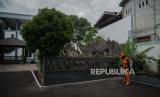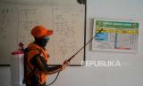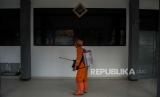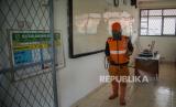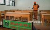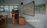 Petugas PPSU Kelurahan Palmerah menyemprotkan cairan disinfektan di lingkungan Madrasah Aliyah Negeri 22 Jakarta, Palmerah, Jakarta, Jumat (4/12). Penyemprotan tersebut dilakukan akibat sebanyak 21 guru dan 9 staf Tata Usaha (TU) di MAN 22 Jakarta terkonfirmasi positif Covid-19 usai melakukan perjalanan ke Yogyakarta. Republika/Thoudy Badai (FOTO : Republika/Thoudy Badai)