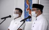 Kepala Staf Kepresidenan Moeldoko (kiri) didampingi Gubernur Jawa Barat Ridwan Kamil (kanan) memberikan keterangan kepada wartawan saat kunjungan kerja di Gedung Pakuan, Jalan Cicendo, Kota Bandung, Jumat (4/12). Dalam kunjungan kerjanya di Kota Bandung, Kepala Staf Kepresidenan Moeldoko mendengar sekaligus membahas penanganan pandemi Covid-19 khususnya di Jawa Barat dengan sejumlah tokoh. Foto: Abdan Syakura/Republika (FOTO : ABDAN SYAKURA/REPUBLIKA)