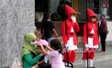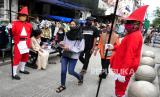 Petugas Jogoboro menggunakan pakaian prajurit mengingatkan pengunjung menggunakan masker di jalur pedestrian Malioboro, Yogyakarta, Ahad (6/12). Petugas Jogoboro bertugas menjaga ketertiban dan menjaga kenyamanan pengunjung di Malioboro. Dan pada masa pandemi Covid-19 ikut mengawasi protokol kesehatan pengunjung. Setiap Sabtu dan Ahad sore Jogoboro akan menggunakan pakaian prajurit. (FOTO : Wihdan Hidayat / Republika)